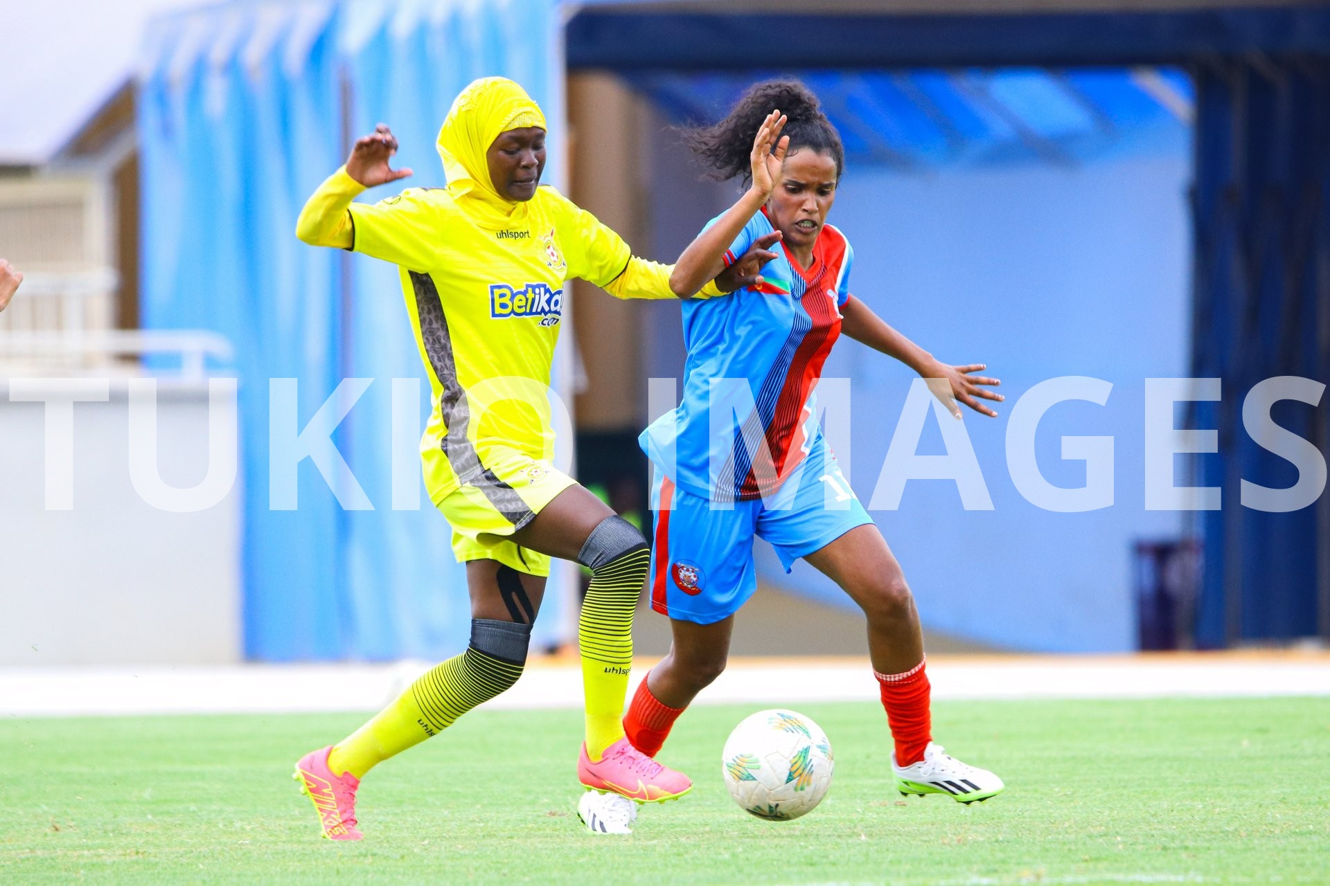 NAIROBI, KENYA – September 10, 2025: Medina Abubakar of Kenya Police Bullets (left) battles for possession with Fithawit Tsige of Den Den during their CAF Women’s Champions League CECAFA Qualifier match at Nyayo National Stadium on September 10, 2025. (Photo: Liam Mwisha/Tukio Images)