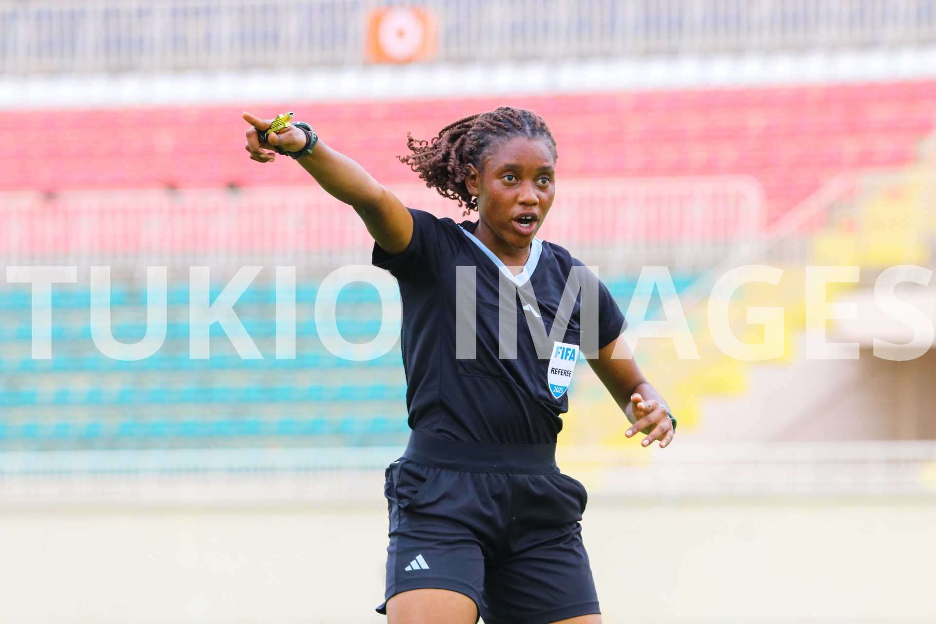 NAIROBI, KENYA – September 10, 2025: Centre referee Byukusenge Henriette officiates during the CAF Women’s Champions League CECAFA Qualifier match between Kenya Police Bullets and Den Den at Nyayo National Stadium on September 10, 2025. (Photo: Liam Mwisha/Tukio Images)